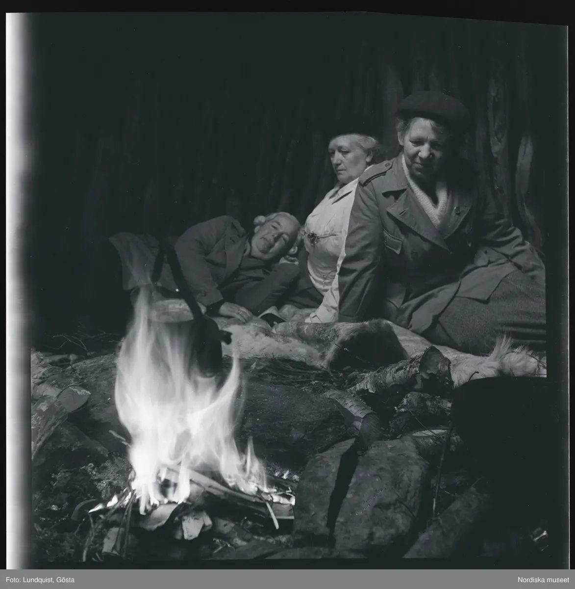 Tre kvinnor sitter runt eldstaden i en kåta.