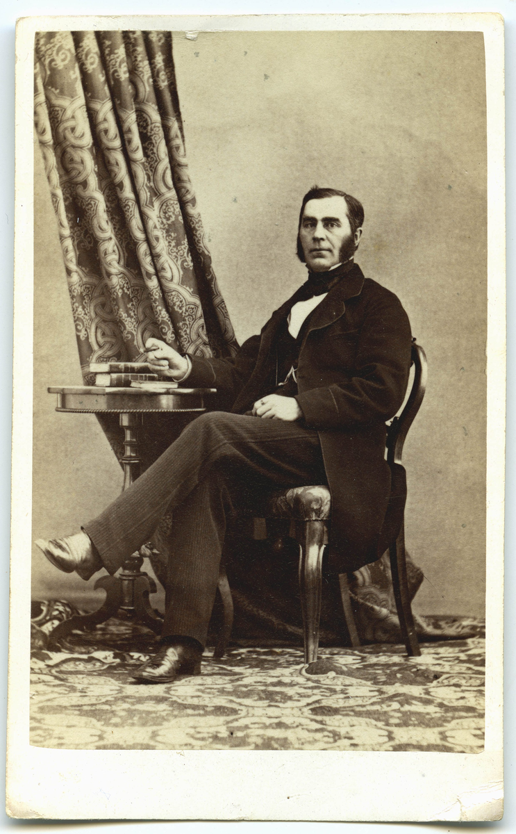 Porträtt på en man i helfigur. Sittande på en stol.