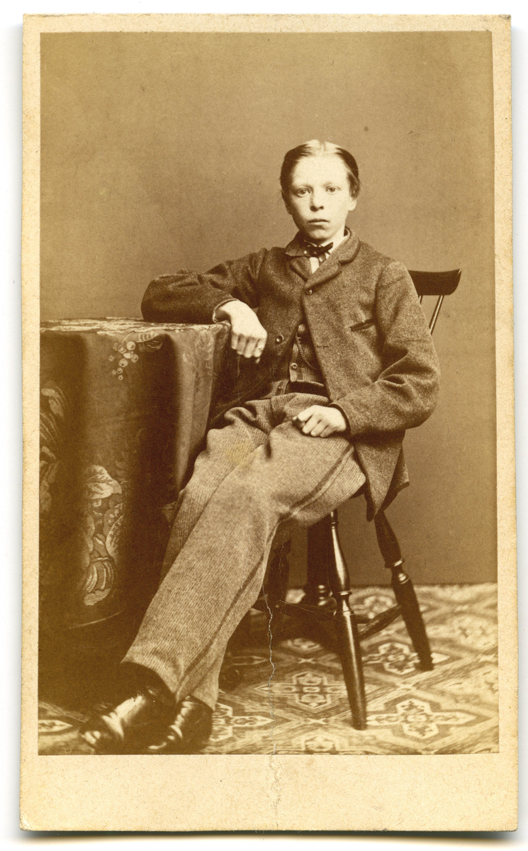 Porträtt på en ung man i helfigur, sittande på en pinnstol.
