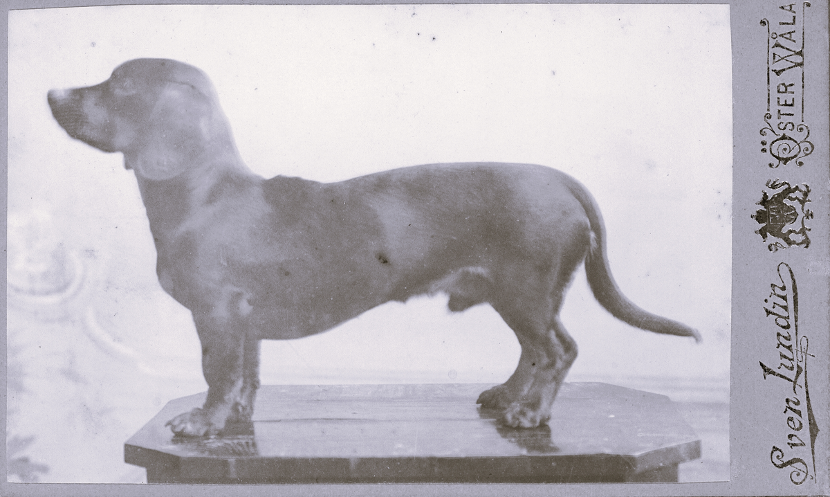 Djurporträtt av en tax. Text baksida kort: "Petter ber om sin helsning".