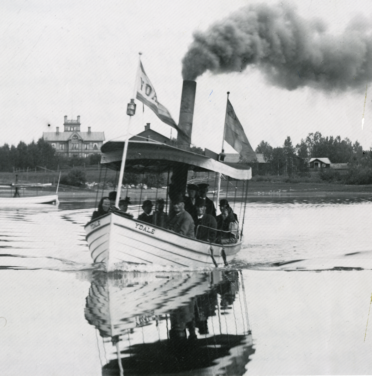 Bollnäs. Omkr. 1890. Ångslupen "Ydal" var den 22 augusti 1896 med om en svår olycka på sjön Varpen, då hon vid det ovanligt låga vattenståndet gick på grund och kantrade. 13 barn fr. dövstumskolan i Bollnäs omkom, liksom institutionens husmor E. Aspekvist och förest. hustru A. Prawitz. Samtliga jordfästes på Bollnäs kyrkogård. Dövstumskolan flyttade till Bollnäs fr. Valbo 1882 för att 1897 flyttas t. Gävle. På bilden, något år innan katastrofen på Varpen m. Sundsåker (nedbr. 1896) i bakgrunden.