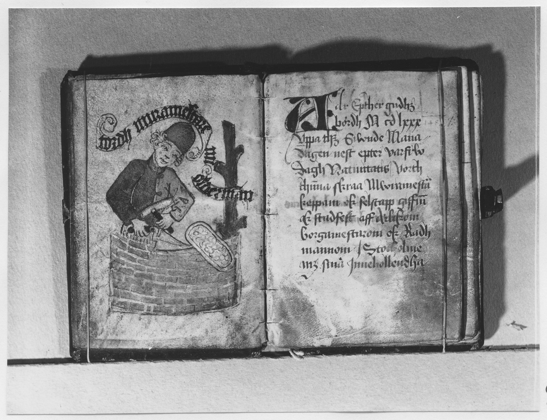 Beskrivning: Stockholms KB, Försättsblad till Skråordning för murarnas skrå 1487