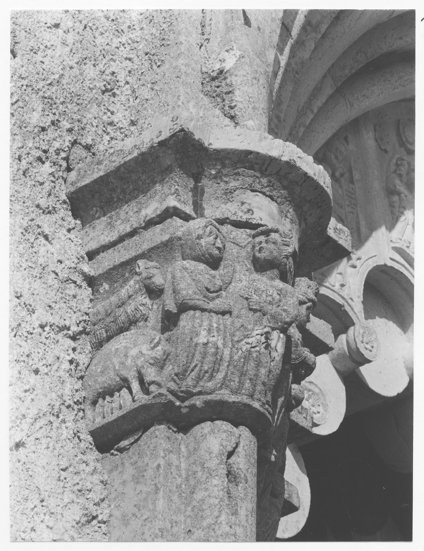 Beskrivning: Stora portalens kapitälbband. Marias bebådelse Maria med gris och lamm.
