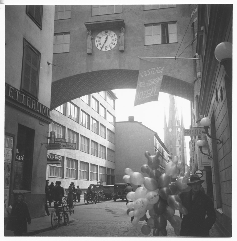 Beskrivning: Gatuliv på Klara Norra Kyrkogata mot Klara kyrka