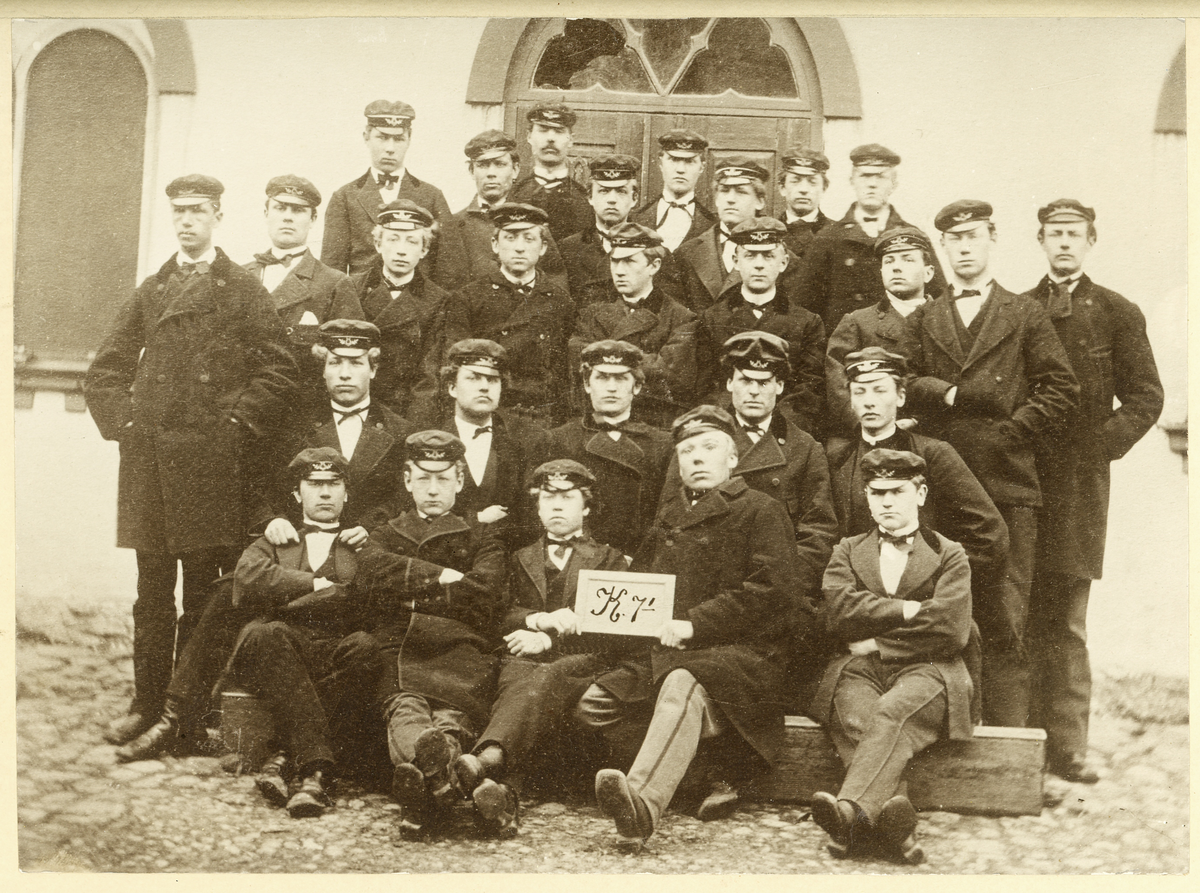 En läroverksklass har samlats utanför entrén till dåv. Växjö läroverk, numera Norrtullskolan, 1875.