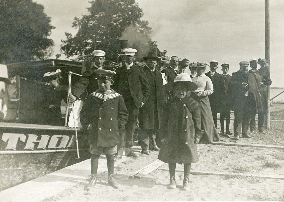 Ett sällskap på utflykt har samlats i slussen vid Åby. Till vänster syns ångbåten "Thor".