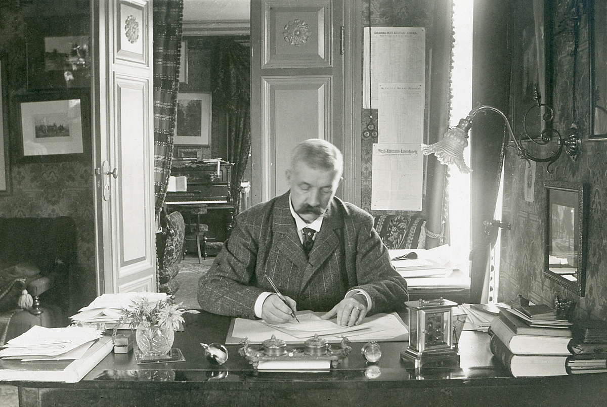 En man i grå kritstrecksrandig kostym sitter och skriver vid ett skrivbord. Bakom honom syns ett piano m.m. i ett annat rum.