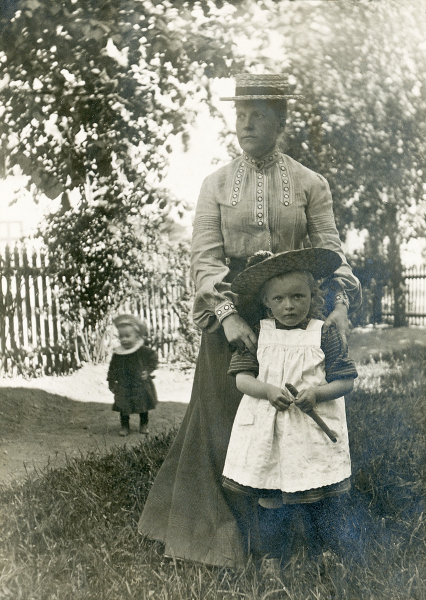 Fru Elisabeth Bergstedt med dottern Margareta i en trädgård. Till vänster syns ännu ett barn, i kolt.