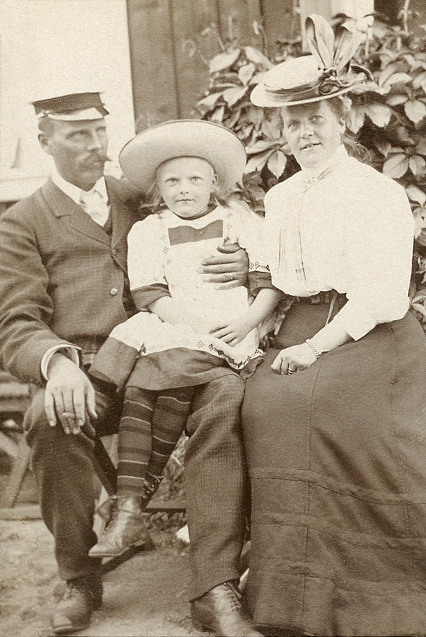 Kronolänsman Albert Bergstedt med dottern Margareta och frun Elisabeth sitter på en bänk i trädgården utanför ett bostadshus.