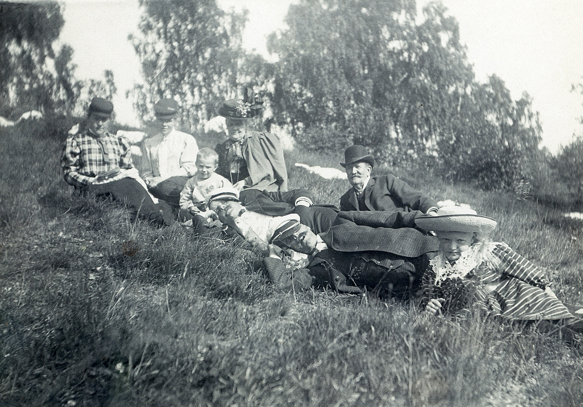 Några personer på utflykt har slagit sig ner i en slänt för en vilopaus.