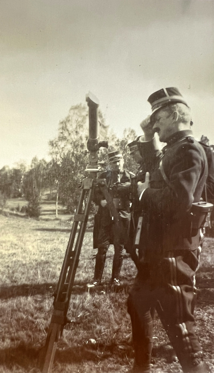 Smålands artilleriregemente, A 6. Eldledning. Kapten C O O D af Sandeberg (C. 5.batt.), vid batterikikaren. Foto från år 1906.