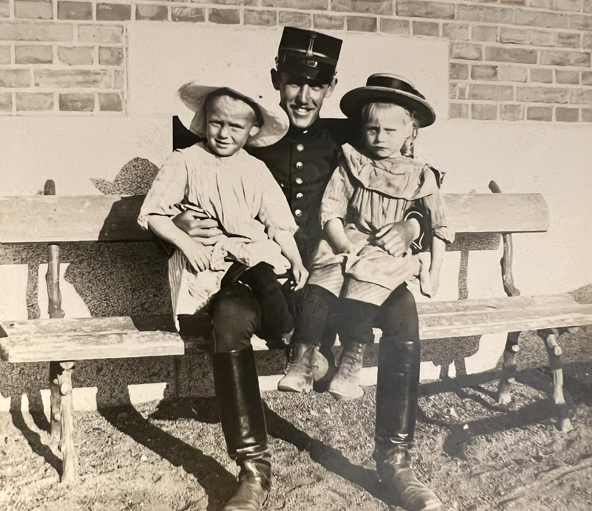 Smålands artilleriregemente, A 6. Underlöjtnant B P Löwenadler med styckjunkare Fogelbergs barn. Foto från år 1906.