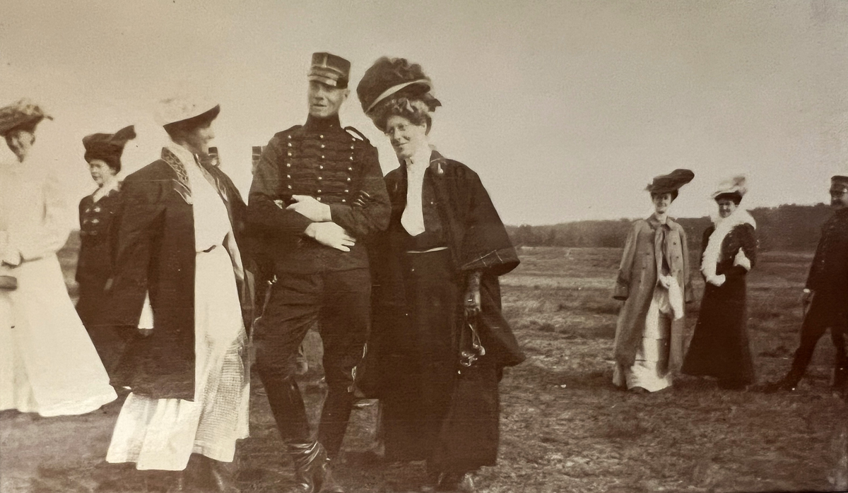 Smålands artilleriregemente, A 6. Fr v: fru Sjöberg, okänd, okänd, underlöjtnant K G B Billsten med syster, fru Ohlsson, fru Holmström, kapten E F Goldkuhl (?). Foto från år 1906.