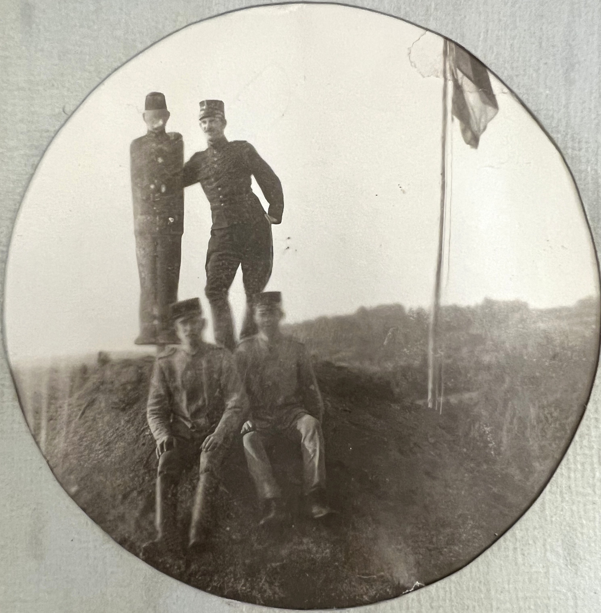 Smålands artilleriregemente, A 6. Underlöjtnant (res.) E V U Landberg på skjutbanan tillsammans med två vpl. Foto från c:a 1900.