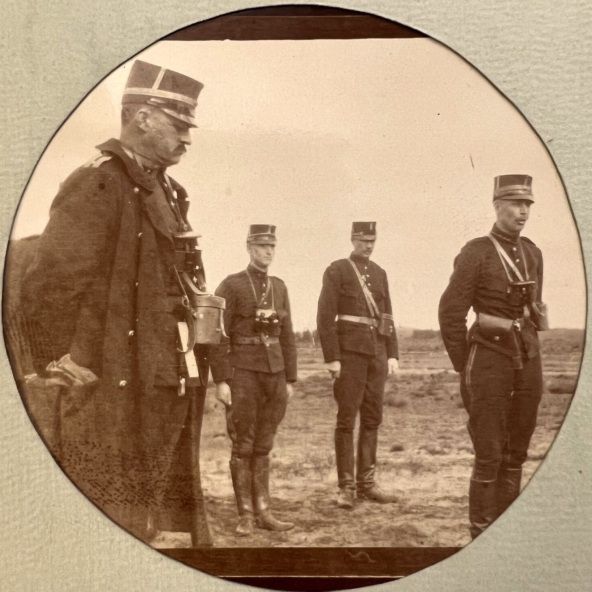 Smålands artilleriregemente, A 6. Fr v: major B A S von Geijer (C. II div.), underlöjtnant C G Wibeck, styckjunkare Sjögren (?), kapten friherre Erik Åkerhielm (reg.adj). Foto från år 1906.