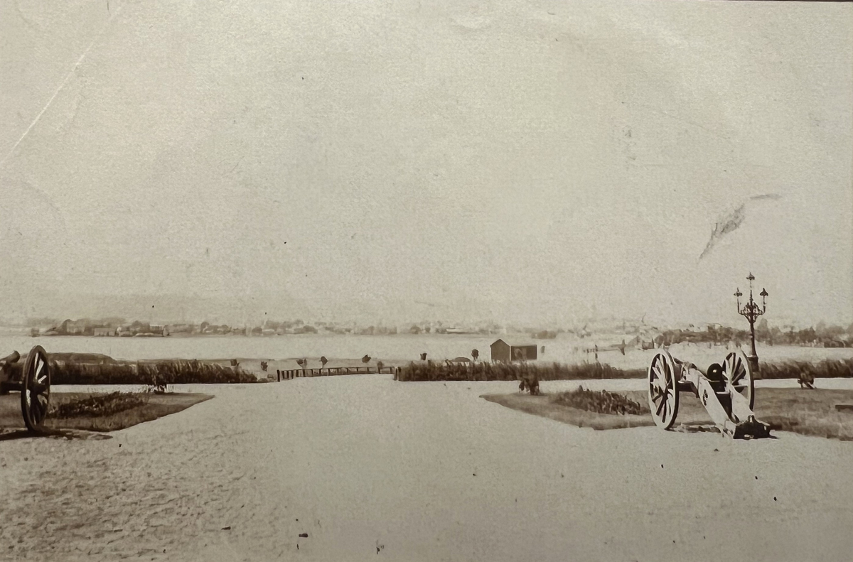 Smålands artilleriregemente, A 6. Vy över Rocksjön och Jönköpings stad, sett från "Valvet". De båda 12 pundskanonerna m/1816 har just kommit på plats. Foto från c:a 1902.