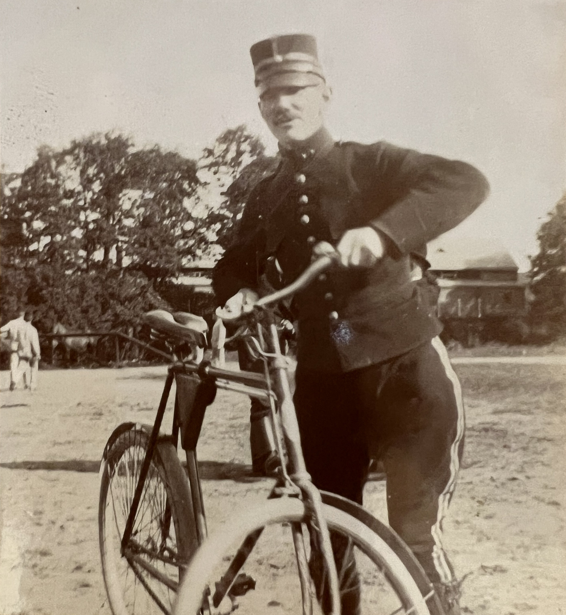 Smålands artilleriregemente, A 6. Löjtnant G A T Sandell med sin velociped. Foto från år 1906.