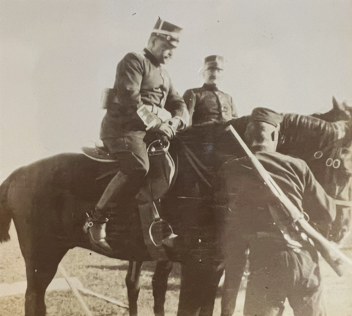 Smålands artilleriregemente, A 6. Fr v: regementsintendent E M H Hedenberg, regementsveterinär J O Hederstedt (?). Foto från år 1906.