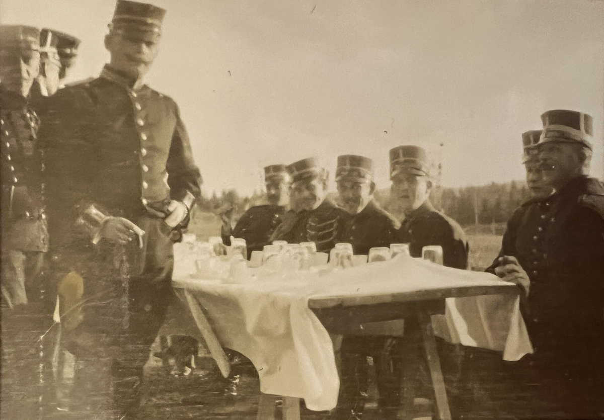 Smålands artilleriregemente, A 6. Utspisning i fält. Fr v: underlöjtnant R T K Sjöberg, löjtnant Raab (I 12), okänd, löjtnant Holm (K 4), underlöjtnanterna B P Löwenadler, C M M Grönwall och C P Dickson (res.), okänd. Foto från år 1906.