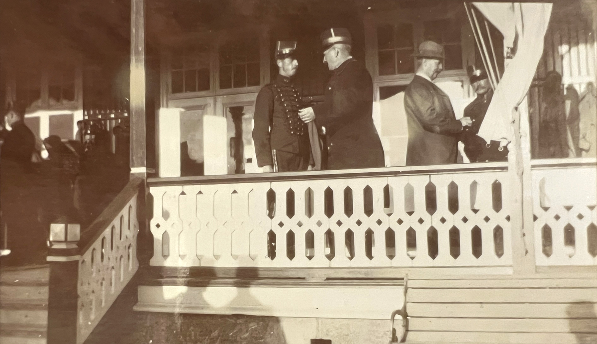 Smålands artilleriregemente, A 6. Östra lägret, Skillingaryd. Fr v: löjtnant S W J Stjernstedt, överste D Hedengren, Ohlsson, överstelöjtnant A G Genberg. Foto från år 1906.
