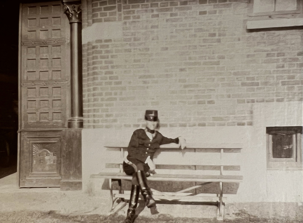 Smålands artilleriregemente, A 6. Löjtnant H Gustafsson som dagofficer, sittande utanför Valvet. Foto från c:a år 1915.