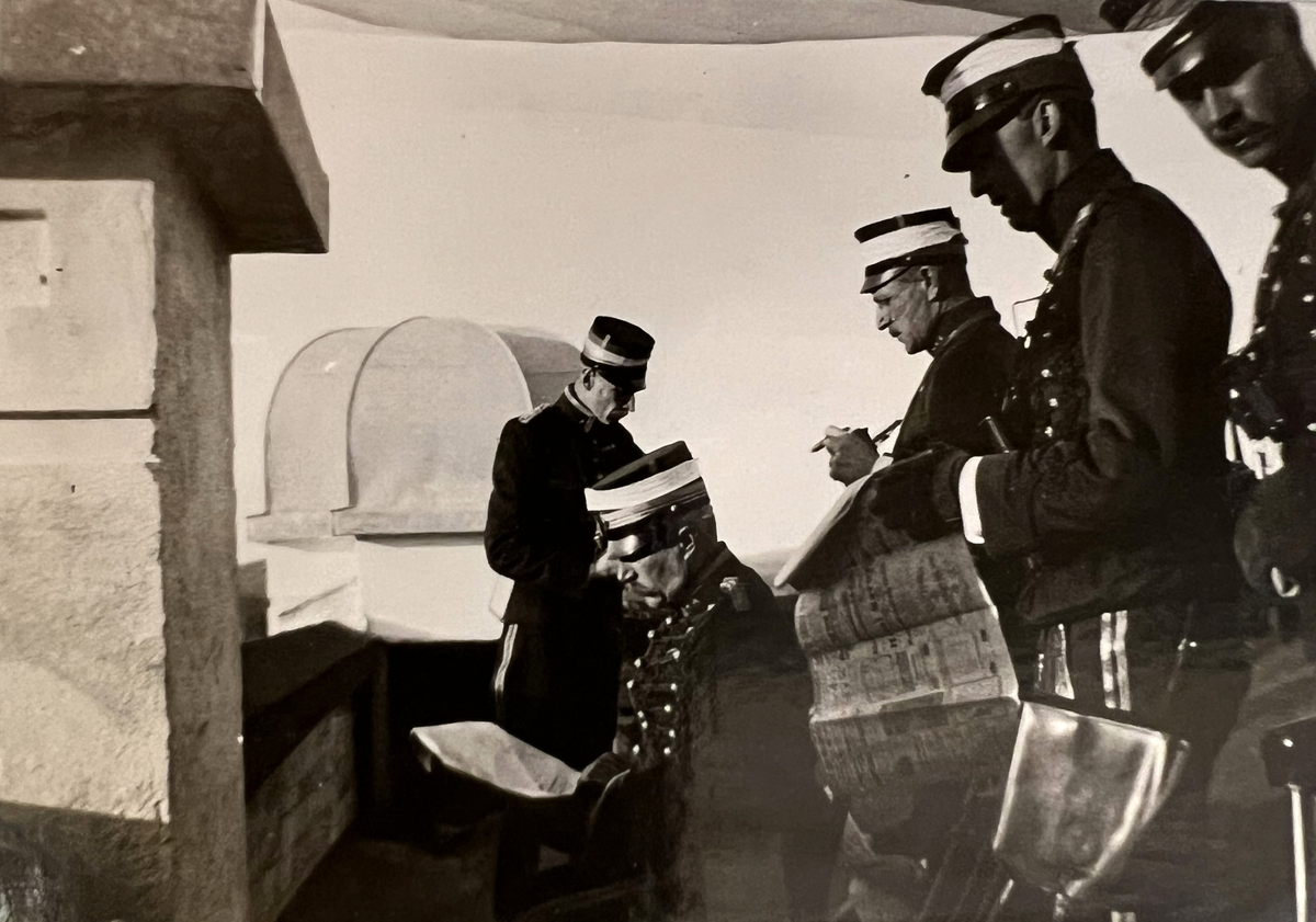 Smålands artilleriregemente, A 6. På observationsplats på ett tak, möjligen under pågående arméfördelningsövning. Fr v: major G M Bendz, överstelöjtnant A G Genberg, kapten N G H Grahl, underlöjtnant E L G Pantzerhielm, löjtnant P U Lagerhielm. Foto från c:a år 1905.