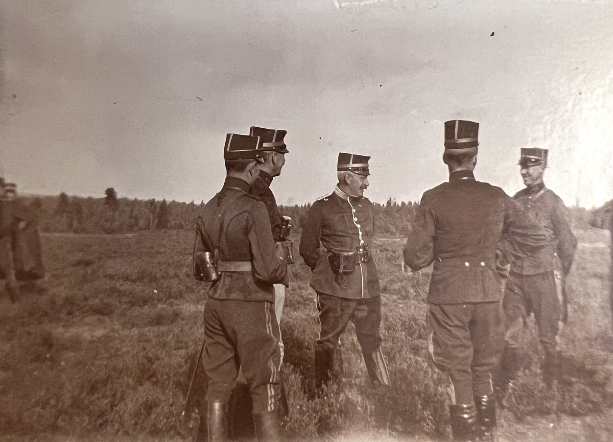 Smålands artilleriregemente, A 6. Stabsarbete i fält under pågående arméfördelningsövning. Fr v: underlöjtnant H A F Cedercrona, kapten C G T Follin, kapten C G A Åstrand (I 4), okänd, löjtnant S A Thorén. Foto från c:a år 1905.