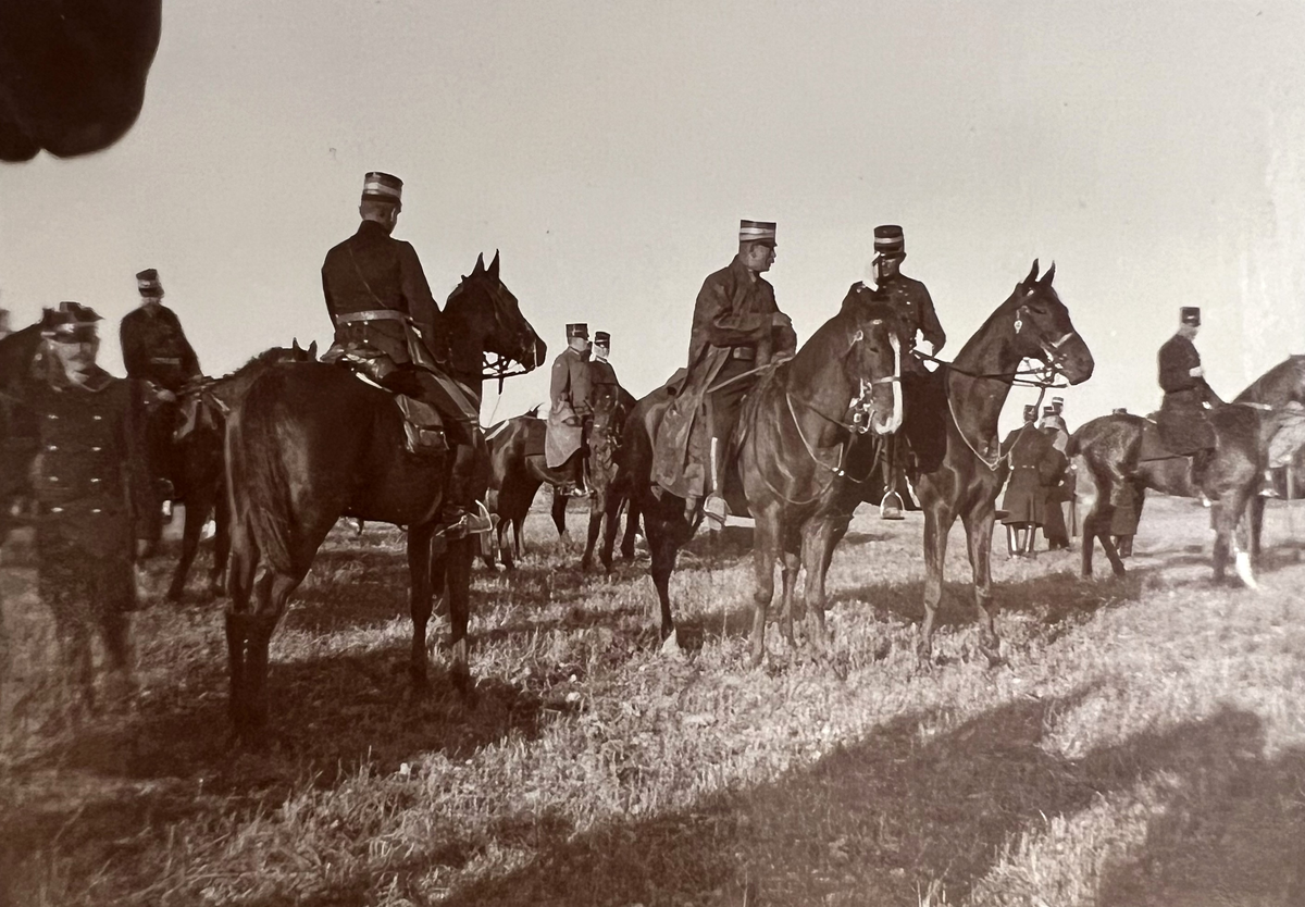 Smålands artilleriregemente, A 6. Stabsarbete i en dikeskant, möjligen under pågående arméfördelningsövning. I mitten till häst överstelöjtnant A G Genberg. Foto från c:a år 1905.