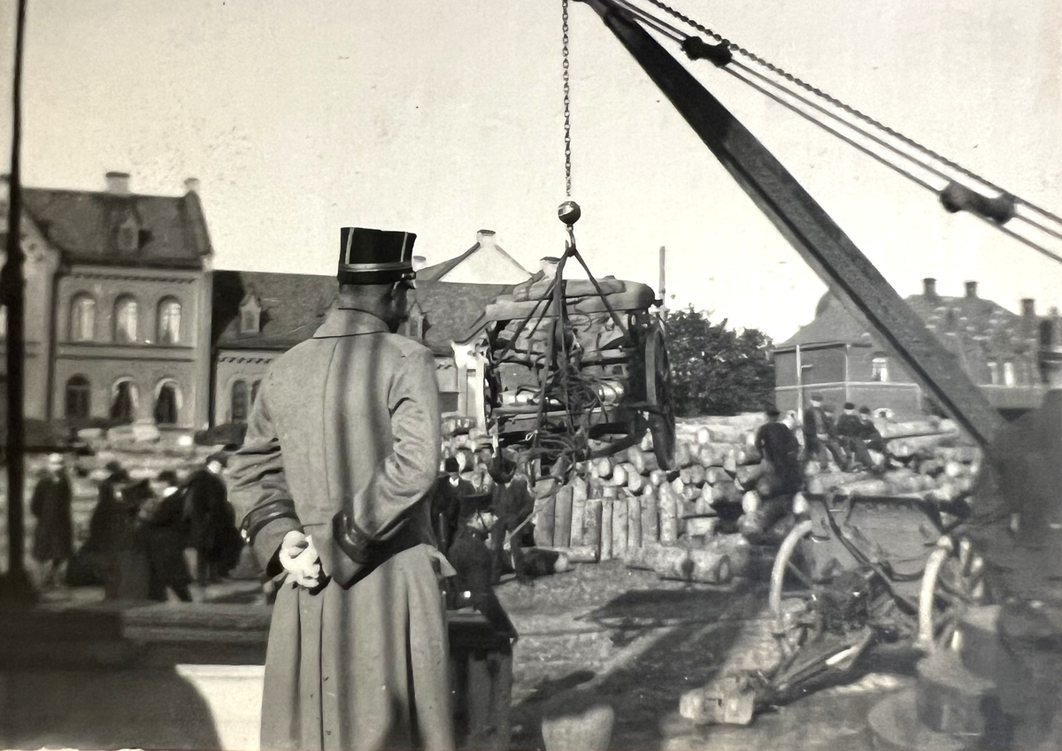 Smålands artilleriregemente, A 6. Västgötamanövern 1912. Lastning/avlastning av hästar och materiel till/från fraktfartyg. Här en föreställare m/1902. Foto från år 1912.