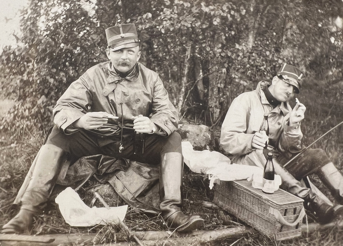 Smålands artilleriregemente, A 6. Matrast. Fr v: Kapten "Kujje", underlöjtnant J A Hygerth. Skillingaryd? Foto från c:a år 1915.