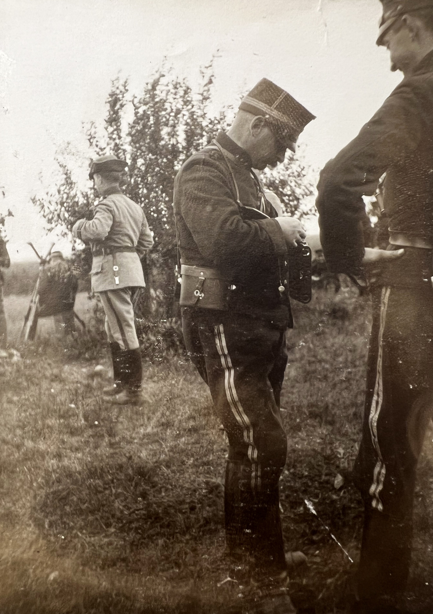 Smålands artilleriregemente, A 6. I förgrunden fr v: kapten "Kujje", "Lilas". Skillingaryd? Foto från c:a år 1915.