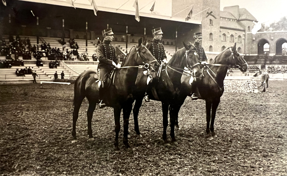 Smålands artilleriregemente, A 6. Fr v: underlöjtnant A J Philipson, löjtnant E L G Pantzerhielm, underlöjtnant S S E Karlstedt(?). Stockholms stadion? Foto från c:a år 1912.