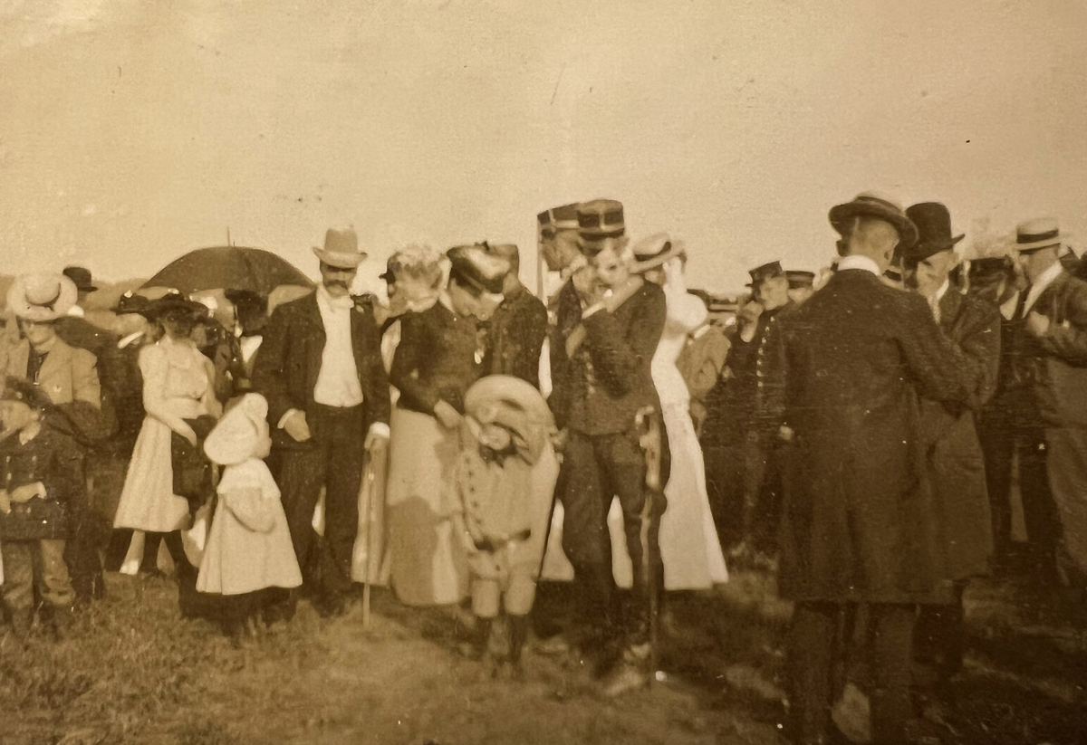 Smålands artilleriregemente, A 6. Fr v: major C O O D af Sandeberg (civil), kapten C G Axelson (med hund), kapten C T Pfeiff (civil), kapten S J G Nordeman (civil). Foto från c:a år 1910.