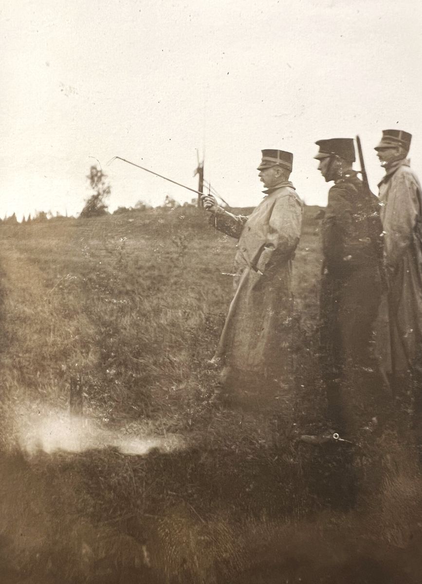 Smålands artilleriregemente, A 6. Fr v: kapten "Kujje", oidentifierad manskap, underlöjtnant J A Hygerth. Foto från c:a år 1910.