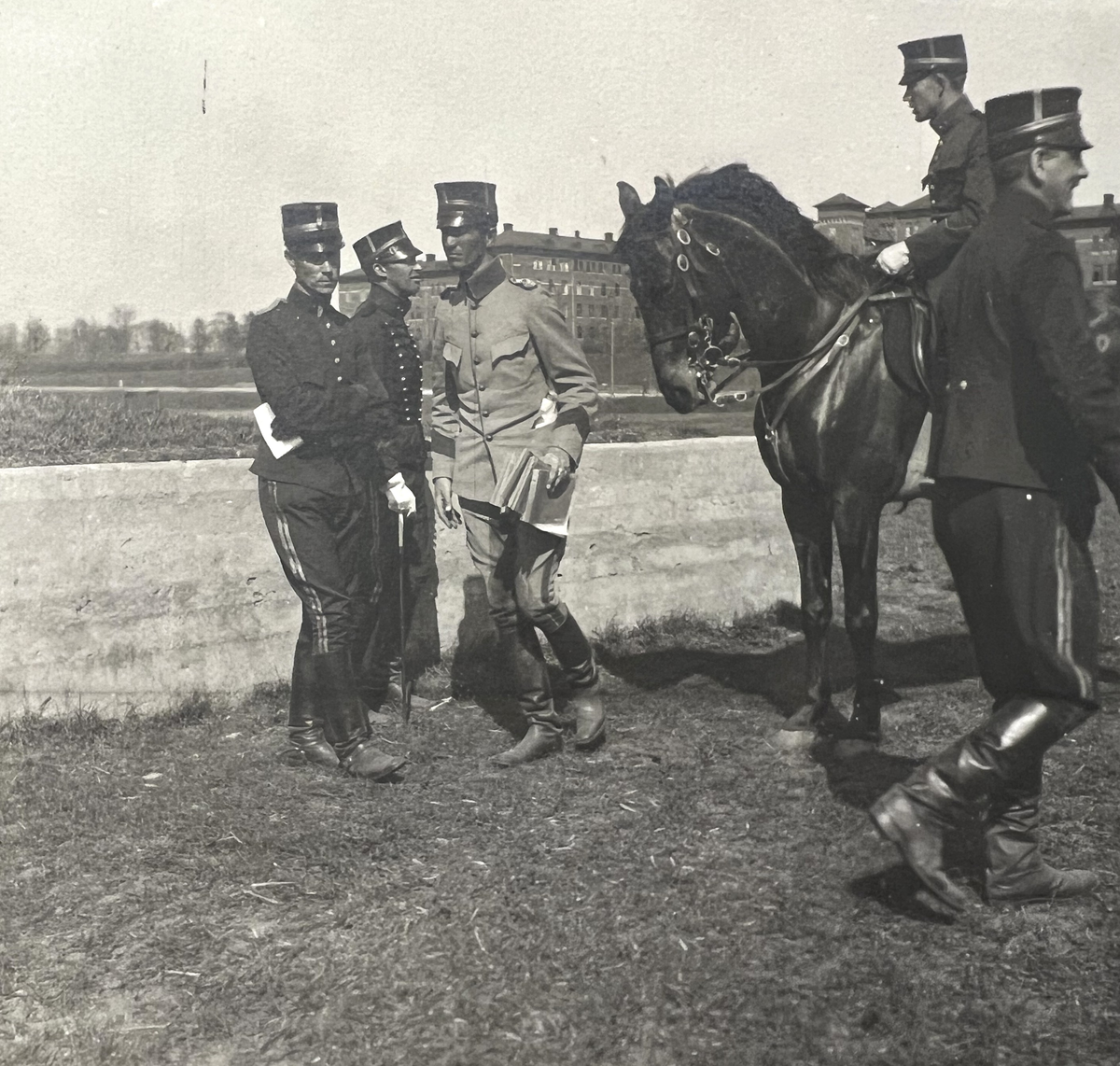 Smålands artilleriregemente, A 6. Fr v: kapten A Holmgren, löjtnant E L G Pantzerhielm, löjtnant C W S Winberg, löjtnant S G Sahlin på hästen "Tingvalla", löjtnant J A Hygerth. Kasernen i bakgrunden. Foto från c:a år 1915.