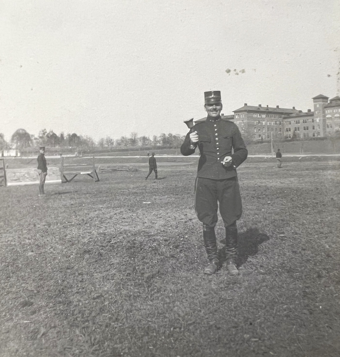 Smålands artilleriregemente, A 6. Löjtnant J A Hygerth. Kasernen i bakgrunden. Foto från c:a år 1915.