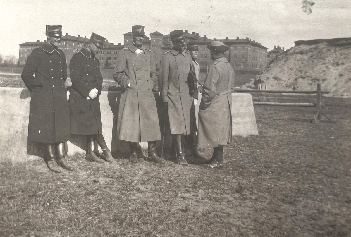 Smålands artilleriregemente, A 6. Fr v: löjtnant G R Zandrén, löjtnant S R A Palmborg, kapten C P Slettengren (med dagofficersbricka), okänd, löjtnant T Melander, kapten "Kujje". Kasernen i bakgrunden. Foto från c:a år 1915.