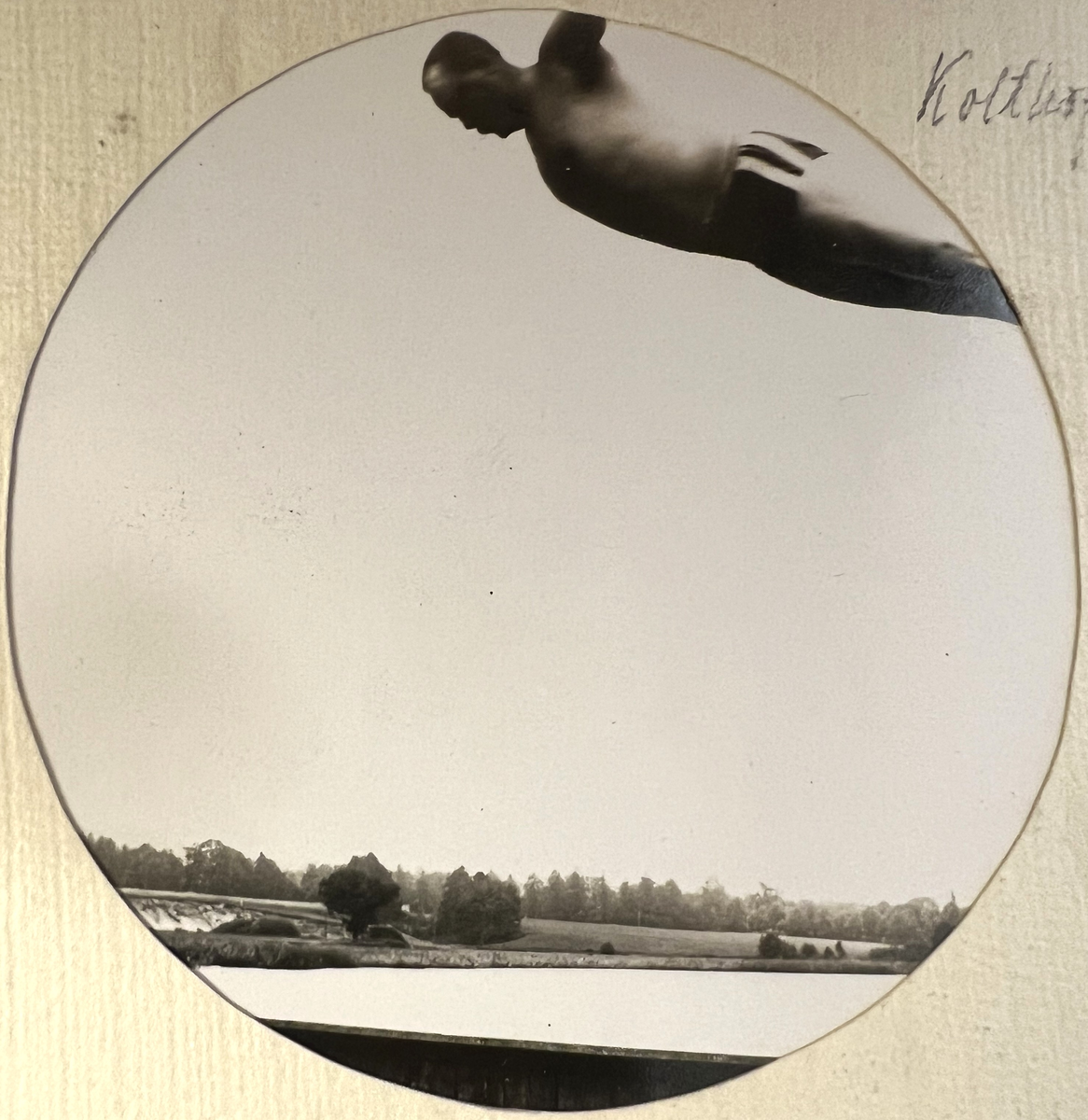 Smålands artilleriregemente, A 6. Underlöjtnant H G L Kolthoff dyker i vattnet. Foto från omkr år 1905.