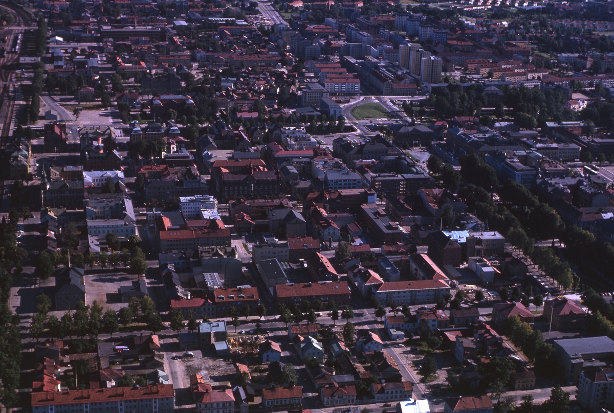 Flygbild över centrala Gävle, till höger Rådhusesplanaden upp mot Rådhuset.