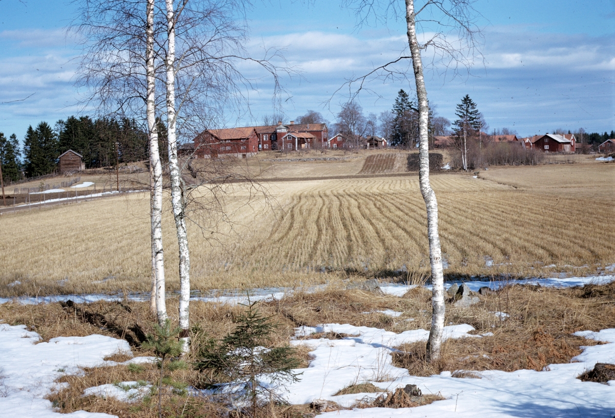 Vy över by med åkrar