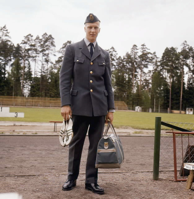 Brevbärare i uniform modell 1962, fotograferad på en idrottsplats med spikskor i höger hand och en väska i vänster.