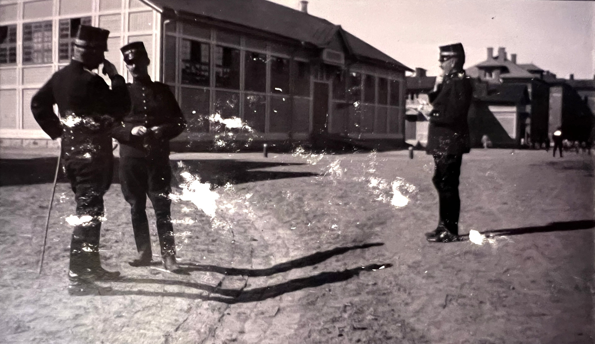 Smålands artilleriregemente, A 6. Fr v: överstelöjtnant A G Genberg, kapten E F Goldkuhl, regementsveterinär J O Hederstedt. I bakgrunden exercishuset, sjukhuset, underofficersbyggnaden och kasernen. Foto från år 1908.