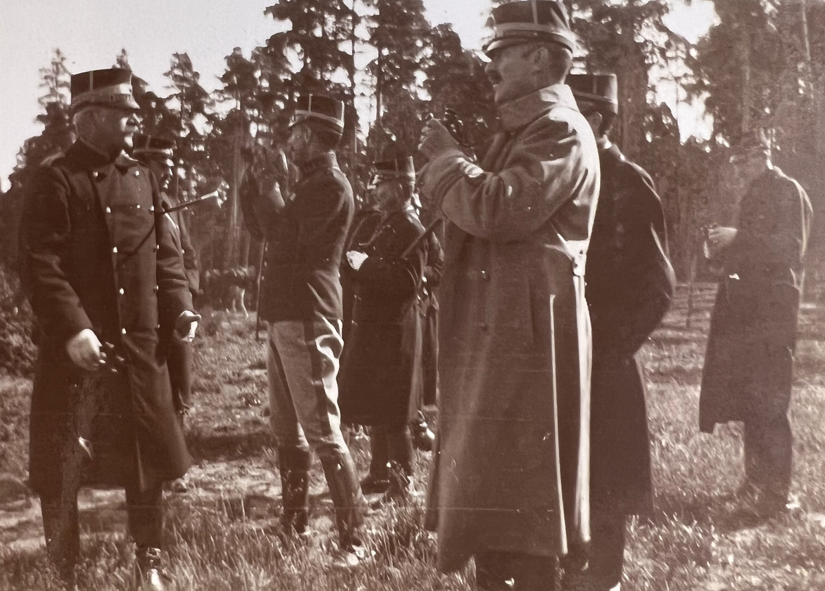 Smålands artilleriregemente, A 6. På observationsplats. Fr v: överstelöjtnant A G Genberg, kapten C G Axelson, kapten C O O D af Sandeberg, löjtnant S W J Stjernstedt, styckjunkare Sjögren. Foto från år 1906.