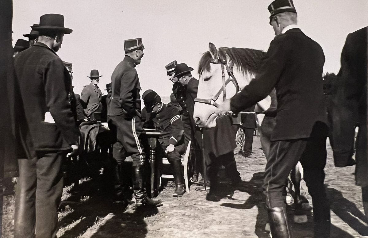 Smålands artilleriregemente, A 6. Inmönstring av hästar. , Kapten C O O D af Sandeberg (C. 5.batt, i profil), bataljonsveterinär Johan Hederstedt (håller hästen). Foto från år 1906.