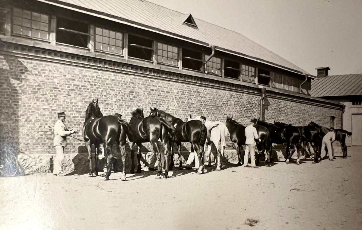 Smålands artilleriregemente, A 6. Hästvård på Ridplan. Foto från år 1907.