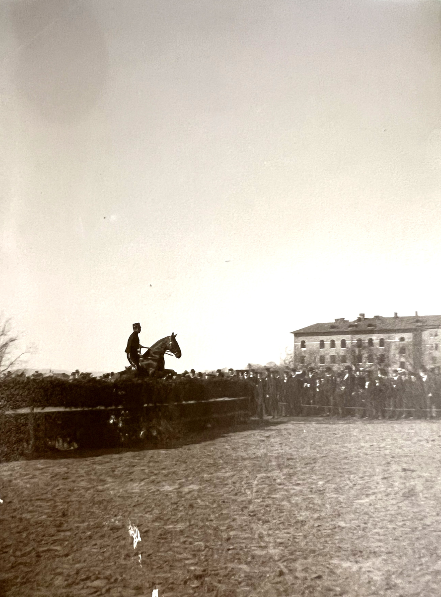 Smålands artilleriregemente, A 6. Kapten G A T Sandell på hästen "Negus". I bakgrunden A 6 kasern. Foto från år 1912.