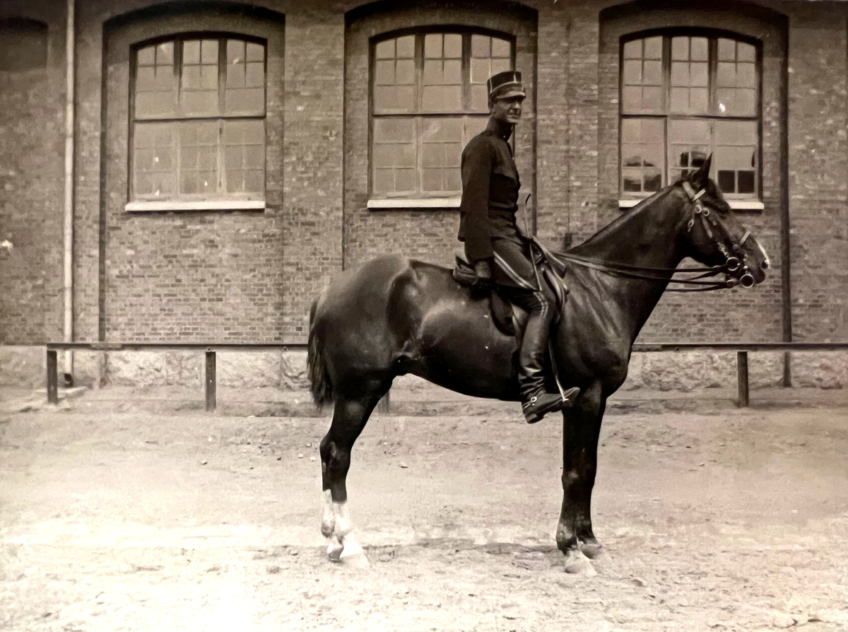 Smålands artilleriregemente, A 6. Underlöjtnant C W S Winberg till häst. I bakgrunden ridhuset. Foto från år 1906.