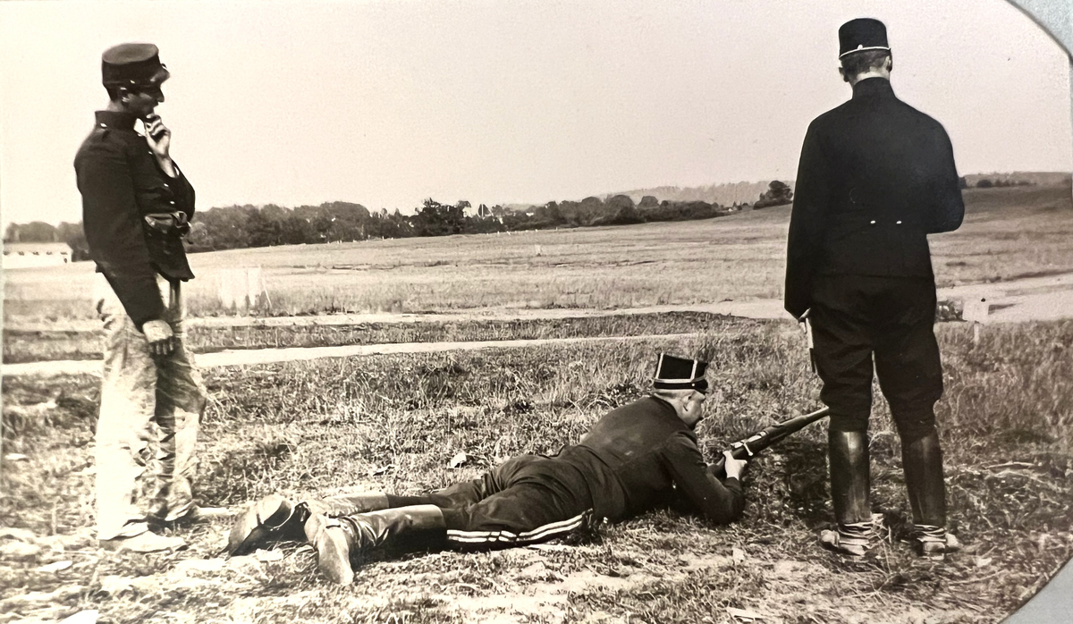 Smålands artilleriregemente, A 6. På A 6 övningsfält. Liggande med karbin löjtnant H G L Kolthoff. Foto sannolikt från år 1908.