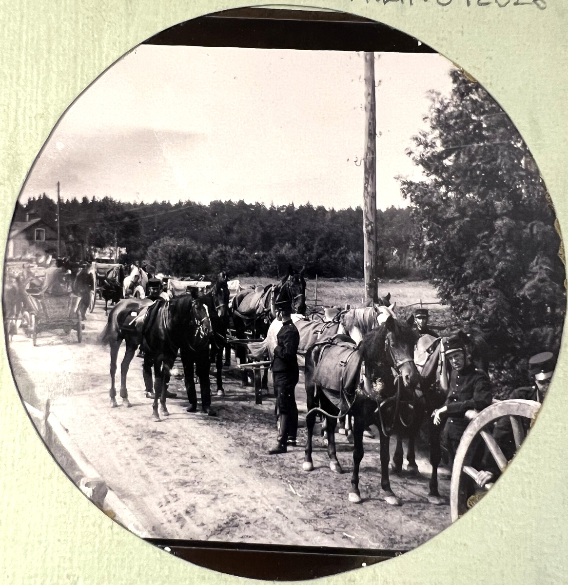 Smålands artilleriregemente, A 6. Rast under pågående marsch med kanonspann. Foto från år 1905.