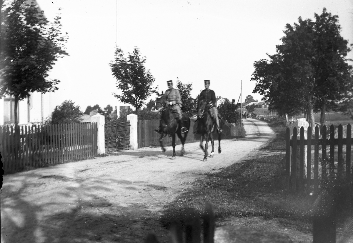 Hälsinge regemente passerar gården i Östby under Första världskriget. Hillströms hus till vänster.